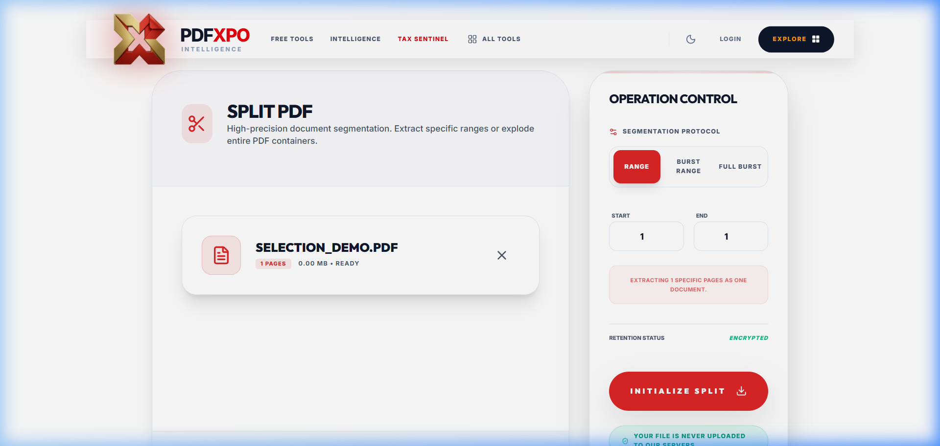 PdfXpo's Split PDF tool supports all three methods in one place. You see a visual thumbnail of every page before you decide what to extract.